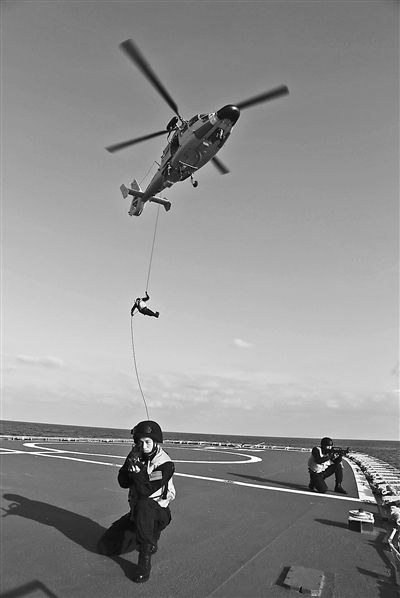 上图:连日来,赴印尼参加“科摩多”联合军演的我海军舰艇编队在西太平洋举行临检拿捕、直升机互降、舰机联合搜救及离舰损管等多个科目的训练演练。图为3月30日特战队员在训练中进行索降。