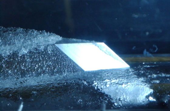 楔形鳍状物刺穿一个超空泡。注意那个局部超空泡正形成于鳍状物的前缘。(源自美国明尼苏达大学气穴与气泡流动研究小组)