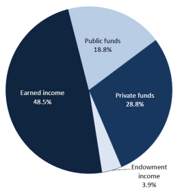 当然,各个场馆之间的收支情况差别很大。以硅谷计算机历史博物馆为例,该馆2014年收入1101万美元,支出781万美元(2013年分别为751万美元和706万美元)。其收入各部分比例为:公共项目34%、投资收入33%、博物馆运营17%、捐赠14%、其他2%;开支各部分比例为:内容和公共项目63%、运行24%、市场和发展13%。