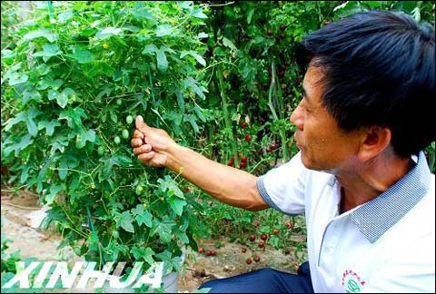 7月2日,山东省平度市明村镇大黄埠村村委会主任吴京华在展示盆栽“拇指西瓜”。