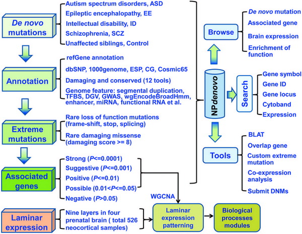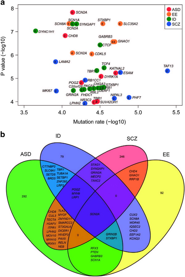 近日,中国科学院北京生命科学研究院吴金雨等课题组通过分析4种神经精神疾病(autism spectrum disorder,ASD;epileptic encephalopathy,EE;intellectual disability,ID;schizophrenia,SCZ),共计3,555个核心家系的17,104个新生突变,研究发现:1)神经精神疾病患者比正常对照个体具有更高的突变速率 (P < 1.3E-7),首次发现升高的突变速率主要是由无义突变、有害的错义突变和移码突变造成的,说明这些有害突变对神经精神疾病的发生具有重要影响;2)基于这些有害突变,总共鉴定了764个神经精神疾病致病基因。在这些候选基因中,不但包括已知的致病基因,例如CHD8, SCN2A, RLEN, NRXN1 等,还包括多个新的候选基因,例如SUV420H1,SLC35A2,KATNAL2,TAF13 等;3)同时发现53个候选基因存在于两种以上疾病中,显著高于随机情况(P < 1E-6),暗示这些疾病的分子通路和遗传机制具有很大的交集;4)研究人员还利用人脑的脑皮层表达数据,发现四种神经精神疾病候选基因在构建共表达网络上面也具有相似的表达模式;5)此外为方便相关科研工作者,研究人员基于上述收集的四种神经精神疾病核心家系测序得到的新生突变数据构建了NPdenovo数据库。同时,还对这些突变进行了详细注释,方便用户挖掘相关致病基因。