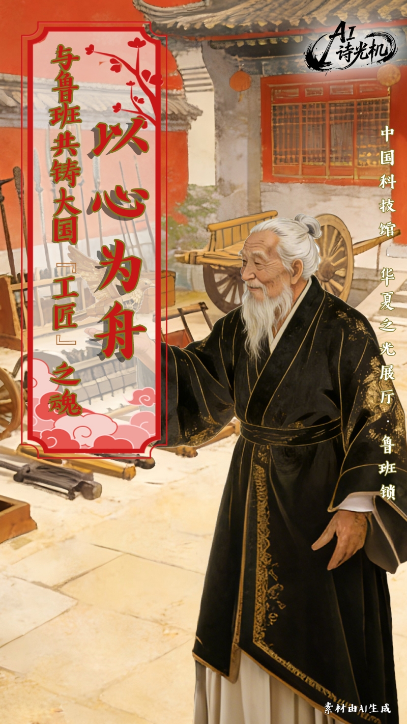 鲁班的“锯子、木鸢”与现代的“大国重器、建筑奇迹”遥相呼应,诉说着一个永恒的信念:创新求实,精益求精;以巧思破万难,以匠心铸千秋。