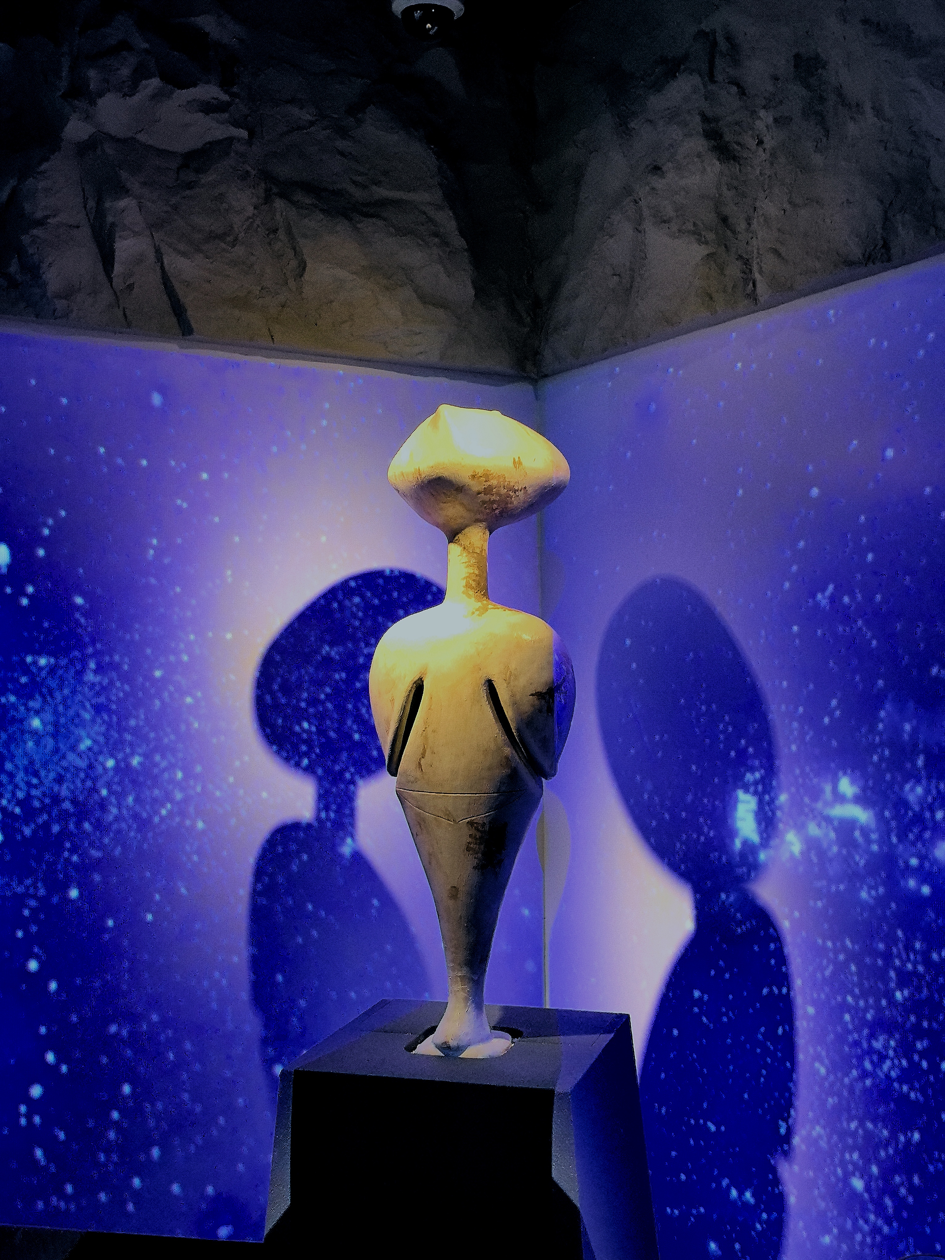 该展览由序厅、“理性的时代”“远去的地平线”和“星辰与我”四部分组成。展厅入口处摆放着精致小巧的大理石雕塑,其原型为公元前3000年的雕塑,因抬头向上仰望天空而得名“观星者”,与展览主题十分契合。展览以各个时代的观星者为线索,设计了星象仪、天文望远镜、月球上的脚印等互动式展品,布展设计非常注重光影效果,让观众沉浸式体验并回顾漫长的天文观测史,了解神秘星空背后的故事。