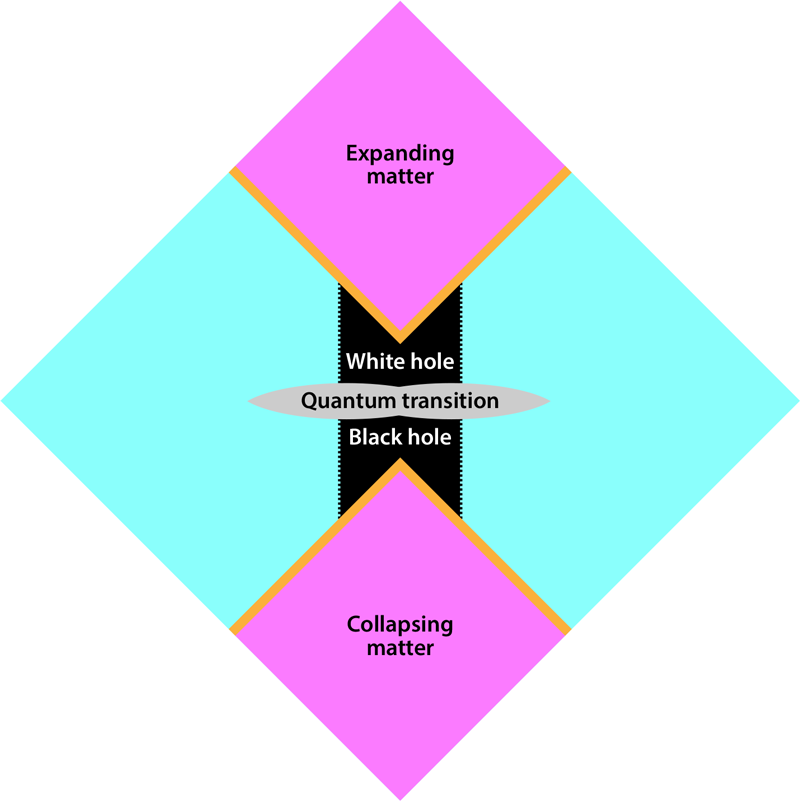 过去几年里,许多的研究团队已经应用了圈量子引力理论去探索黑洞的演化。基于黑洞白洞转变的预测,这些努力正在构成一个令人信服的图像(图一),可以概括如下。在黑洞中心,时空并不会在奇点终结,而是继续穿过一个短暂的过渡区域,在那里量子效应违背了爱因斯坦方程。从这个区域开始,时空以白洞的内部结构浮现,这是物理学家John Lighton Synge在20世纪30年代提出的一种可能性。随着黑洞中心的演化,它的外表面(视界)会因为释放辐射而缓慢缩小——这种现象是由史蒂芬霍金首次描述,这种收缩会持续到黑洞视界到达普朗克尺度(Planck size)(量子引力的特征尺度)或更早,在这一程度上,量子跃迁(“量子隧穿”)发生在黑洞视界中并把它转变为白洞视界(图二)。由于异常扭曲的相对论几何,白洞的内部在中心产生并连接着白洞视界,完成白洞的转变。