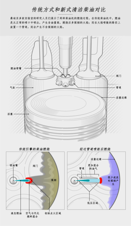 相比汽油,柴油的燃烧过程具有更高的燃烧效率,但是柴油也会释放有毒的氮氧化物(NOx)。在普通的发动机中,这些有毒的气体通过稀释来将排放讲到最低。这是通过将前一个做工循环产生的含氧量较低的燃烧后气体送回进气口,降低燃料-空气混合物的温度和氧气浓度,从而减少了氮氧化物的产生。但是,这种常见的减少氮氧化物技术会降低燃料-空气混合物的温度,从而使得燃烧不充分,导致部分燃烧的碳颗粒产生。这个难题已经困扰了柴油工程界很长一段时间了,工程师们称之为煤烟-NOx权衡。Paul Miles,桑迪亚的发动机研究项目经理认为:“打破煤烟和氮氧化物之间的平衡在现在柴油发动机工程界中有着最高优先级。”