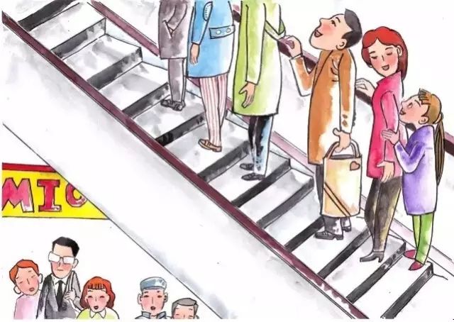 在一些国家和地区,乘坐扶梯时,确实要求"靠右站立,靠左急行",但"左行右立"的方式会使电梯长时间承受不平衡压力,让电梯右侧严重倾斜,影响电梯寿命,增加风险。