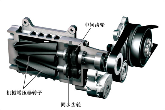 机械增压器(Supercharger)是由发动机曲轴经齿轮增速器驱动的一种增压装置。发动机在运行时,气缸内的油气混合气燃烧推动活塞做功进而带动曲轴旋转,与此同时,曲轴驱动机械增压器的转子旋转,能够达到增大进气压力和加快空气流动速度的目的,使更多的空气进入发动机进气歧管。由于进气量的增加,可相应地增加供油量,从而可以增加发动机功率。机械增压能有效地提高发动机功率,尤其是低速增压效果更好。另外,机械增压器与发动机容易匹配,结构也比较紧凑。但是,由于驱动机械增压器需要消耗发动机功率,因此燃油消耗率比非增压发动机略高。