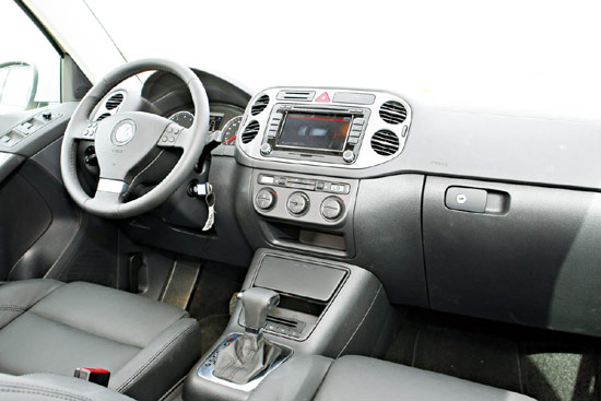 Tiguan是基于PQ35平台开发得来的,而这点即便不说,相信很多人也会从内饰风格中察觉出来。车内的设计几乎就是GolfPlus以及CrossGolf的翻版,Tiguan的仪表盘和方向盘样式,中国用户也是再熟悉不过了,完全是速腾模样,所以给人的新鲜感不算强烈,但是大众产品精良的做工和选材却是值得称道,无论任何地方的细节,都经得住仔细打量。