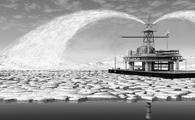 科学家提出一个大胆的设想:冬季,8 000艘造冰船将驶入北极,在温度低于14华氏度的时候,造冰船上的风力抽水机将在现有大块浮冰(浮冰群)的头顶上演一场盐水雨,制造新的盐冰层。春季来临时,造冰船将向新形成的含盐浮冰群喷射更多的水,待到盐冰融化之后,高密度的冷盐水将沉入大洋深处,进而为洋流提供推动力。其结果是:下沉洋流将增加6%,足以维持这一系统的正常运转。