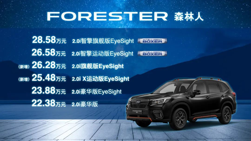6月29日,斯巴鲁旗下新款森林人宣布上市,销售价格为22.38万~28.58万元,新车取消了老款车型的2.0i智擎运动版和2.0i智擎旗舰版,并新增了2.0i X运动版EyeSight和2.0i旗舰版EyeSight两款车型。