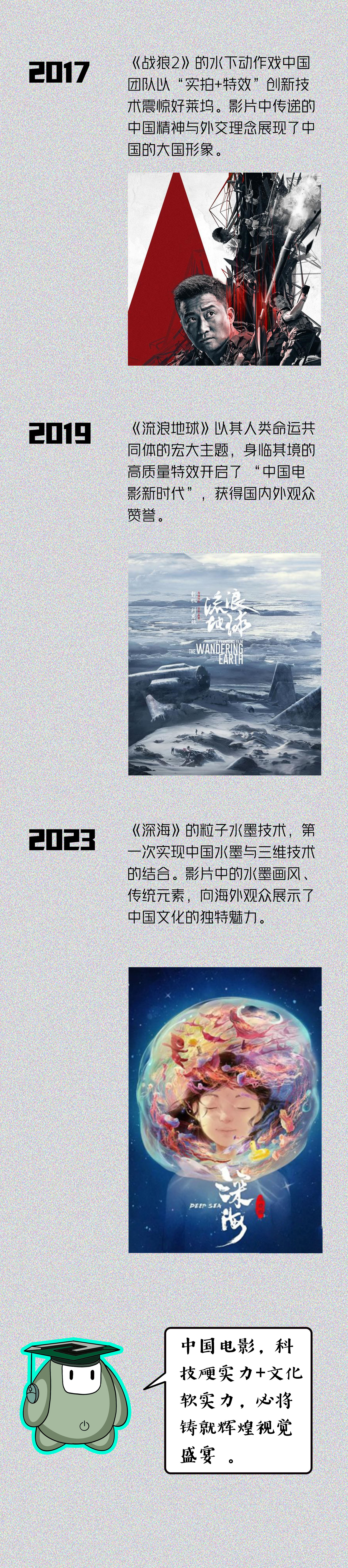 电影的发展离不开科技的支持,从黑白、无声的时代到彩色、有声的时代,从装置特效到数字特效,一部脍炙人口的电影作品背后往往蕴藏着科技突破。中国电影科技后来居上,带领着中国文化走出国门,将中国的故事讲给更多人听。