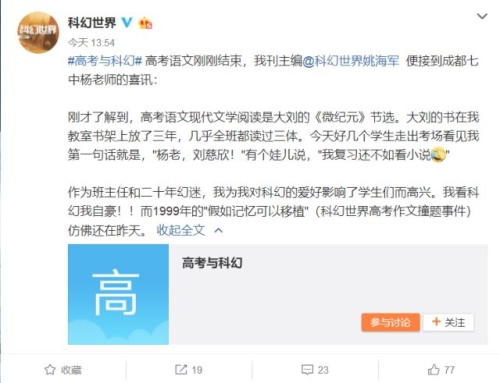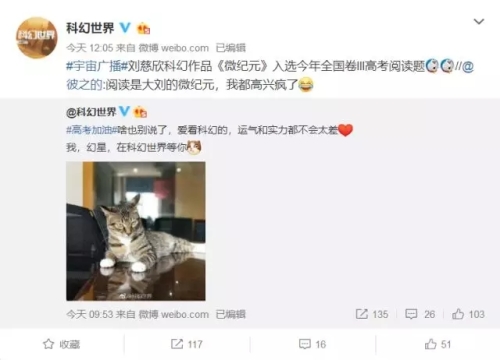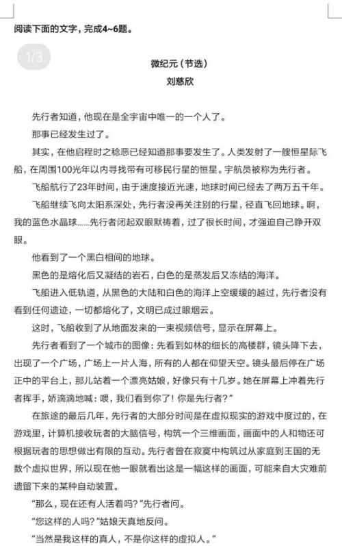 是的,你没看错!刘慈欣发表在《科幻世界》2001年第4期上的短篇小说《微纪元》,这次入选了今年高考全国卷III的语文阅读题!