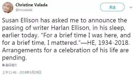 著名科幻作家、编剧哈兰·埃利森于2018年6月28日去世,享年84岁,其好友克里斯汀·瓦拉达(Christine Valada)宣布了这一消息,表示他是在凌晨时间,于睡梦中安详离去。