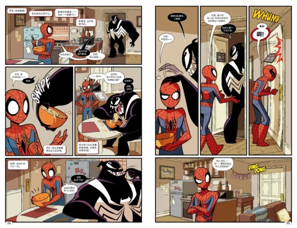 作为本书别册的《蜘蛛侠与毒液:麻烦冤家》同样将令读者耳目一新。在看惯了漫威宇宙动辄跨越数百万年、波及整个宇宙的沉重宏大的史诗之后,《麻烦冤家》就像是隆重主菜后的小布丁,清新爽口,却又延续了美妙余味。