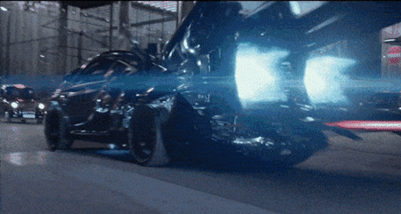只要按下,车子轮胎收缩、外壳重组,硕大的推进器喷射出蓝色火焰!