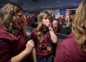 “Altitude convergence, the radar has locked on the ground.” [Applause] “Standing by for lander separation…lander separation commanded, altitude 600 meters…gravity turn, altitude 400 meters…300 meters…200 meters…80 meters…60 meters…50 meters, constant velocity…37 meters…30 meters…20 meters…17 meters, standing by for touchdown…”