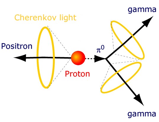 预测的质子衰变模式之一:一个质子衰变为正电子和一个中性介子。中性介子立即衰变为两条伽马射线。(图片来源:超级神冈探测器官网)