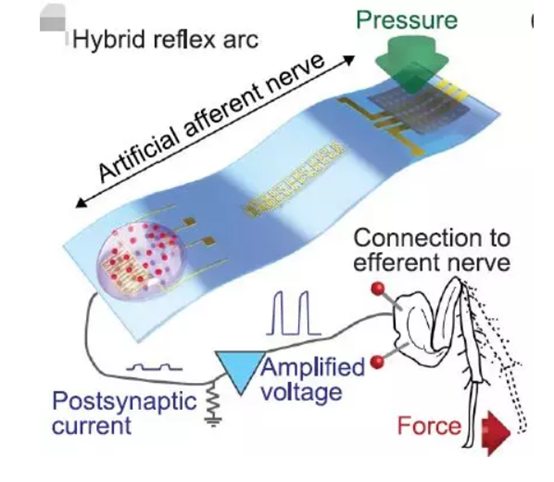 皮肤内的多种触觉感受器将捕捉到的触觉信息通过多层中间神经元传输到脊椎,神经纤维内的多种传入神经和突触会将感受器的传入信号进行编码和分离。最后脊椎将编码和分离后的信号传输到大脑。针对这个问题,科学家们发明了人造传入神经。这种人造传入神经有三个核心成分:压阻型压力传感器、有机环形震荡器和突触晶体管。压力传感器负责获取压力信息。环形振荡器代替神经纤维,将压力信号转化为与感觉神经元动作电位的频率相匹配的电压脉冲。突触晶体管将这些脉冲信号整合并转化为突触后电流,并与生物体内的传出神经对接,形成一个完整的单突触反射弧。