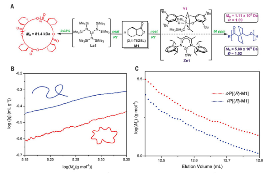 “升级版”的单体是一种基于γ-丁内酯的3,4-反式六元环稠合衍生物(M1)。在镧系配合物催化下,该单体分子在室温下即可完成开环聚合反应。镧配合物催化剂具有很好的催化选择性和活性,用量仅为0.1~0.2%,即可实现大于80%的转化率。由于聚合过程中,一旦达到一定的链长,环状聚合物的分子量就受到环化倾向的限制。研究者又开发了钇配合物Y1和锌配合物Zn1催化剂,用于制备高分子量线性聚合物。Y1催化剂用量50 ppm时,室温下可获得80%-91%的转化率,聚合物的平均分子量为1.11×106 g/mol。相比于镧和钇,锌的含量更为丰富,对环境也更加友好。锌配合物Zn1做催化剂时,0.02 mol%催化剂用量在室温下3小时可以获得82%的转化率,聚合物的平均分子量为307 kg/mol,分子量分布极窄(? = 1.01)。