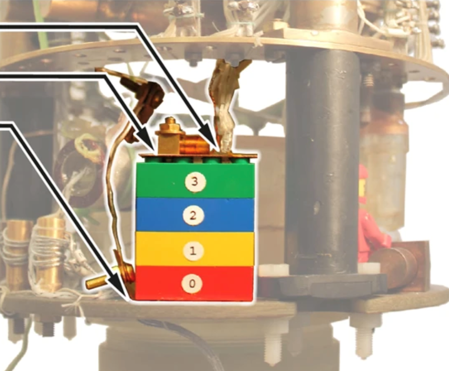 研究人员研究了模块化丙烯腈丁二烯苯乙烯结构,该结构包括四个标准乐高块(目录号3001),这些块垂直堆叠并安装在兰开斯特大学建造的3He / 4He稀释冰箱中。由于市售的乐高积木以10μm^3的精度模制而成,因此很容易精确地复制结构。我们知道,这些积木块与块通过其互锁的几何夹紧力完全保持在一起,因而无需添加粘合剂材料。该叠层的总高度为40.2 mm,占地面积为502 mm2,重量为9.28 g。 在结构的上端和下端的铜板连接处借助真空油脂进行连接,以改善热接触。下铜板与稀释装置的混合室热连接,在上铜板上安装了3Ω的锰铜丝加热器和校准的电阻温度计。