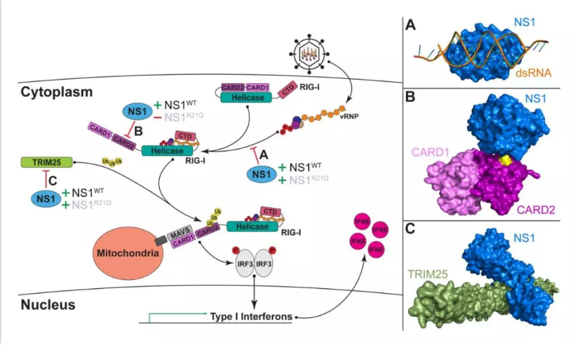 通过分子生物学技术,研究人员发现当野生型NS1拮抗RIG-I信号引起固有免疫时,突变型NS1却允许这种信号。