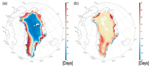 (b) 从(a)所示的星载无源微波数据获得的与1981-2010年基线期有关的融化日数异常
