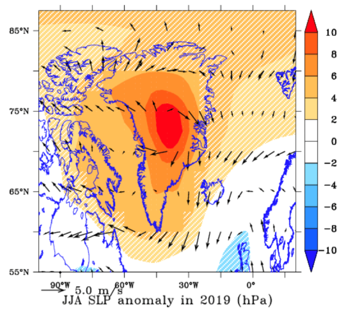 2019年夏季格陵兰岛上空的平均气压,箭头表示风向 图源:文献[1]