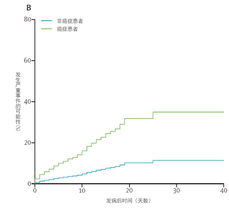 此外,研究者使用Cox回归模型显示,癌症患者恶化更快(中位至严重事件的时间为13天 vs 43天,P<0.0001;根据年龄进行调整后的风险比HR为3.56,95% CI 1.65至7.69)。