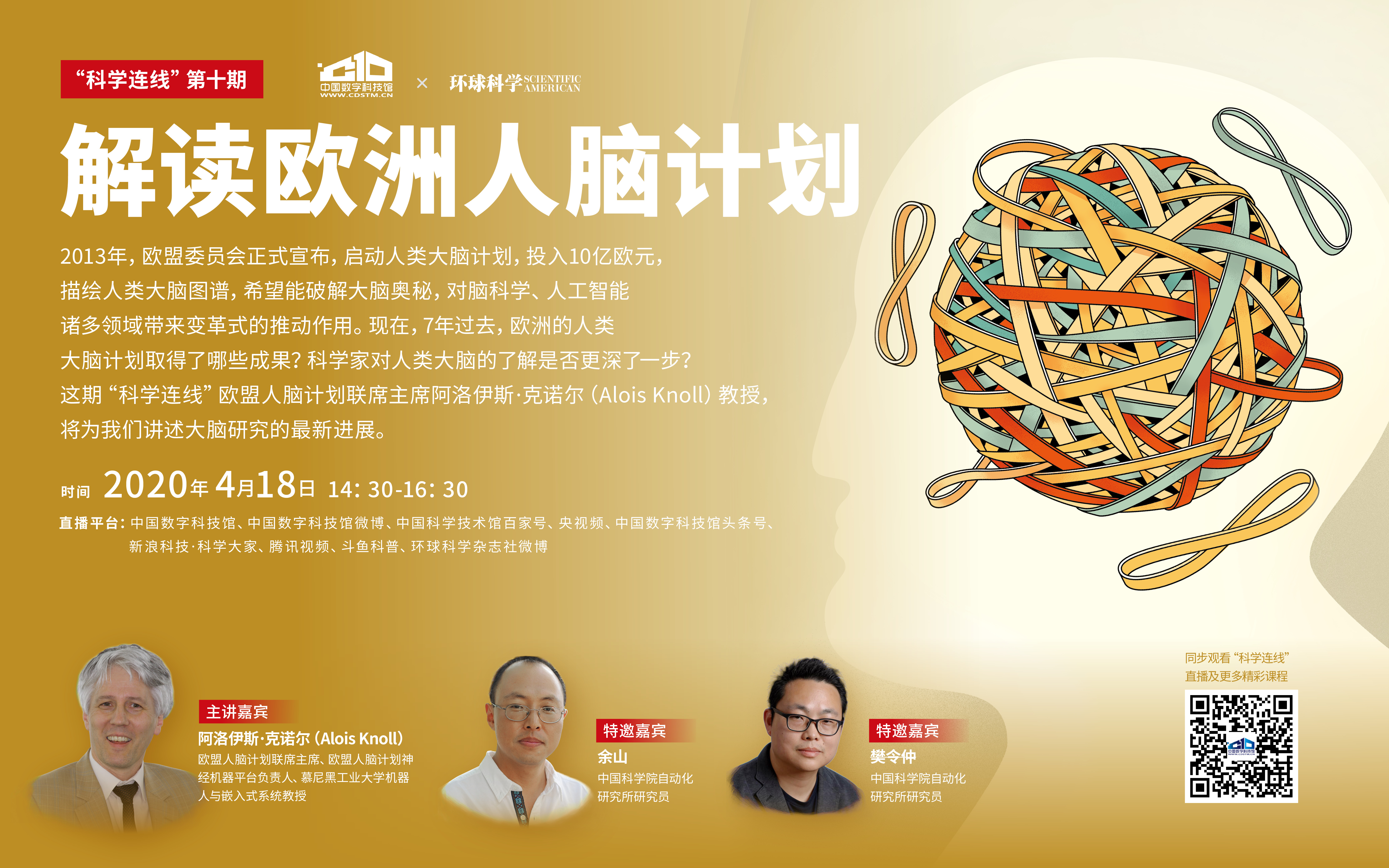 本期的科学连线,欧洲人脑计划核心科学家、德国慕尼黑工业大学教授阿洛伊斯·克诺尔(Alois Knoll)将为我们讲述HBP过去7年的故事,以及这个项目将会带来怎样的改变。除了克诺尔教授,来自中国科学院自动化研究所研究员余山和中国科学院脑科学与智能技术卓越创新中心的樊令仲两位科学家也会参与直播。他们将与克诺尔教授展开对话,讨论脑科学的未来及应用。