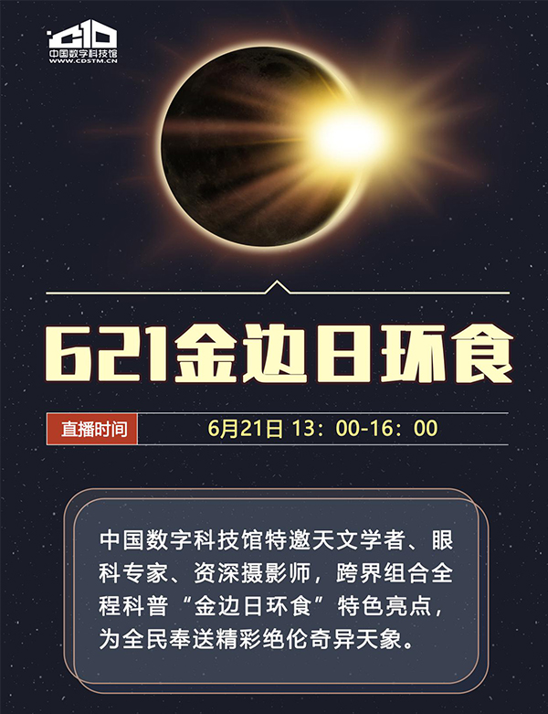 针对本次日环食,中国数字科技馆将携手中国科学院国家天文台阿里观测基地(阿里天文台科普站)、中国科学院云南天文台丽江观测站、双子天文台及天文爱好者协会,并邀请了中国科学院国家天文台研究员-国家天文科学数据中心常务副主任崔辰州、中国科学院国家天文台-太阳磁场与磁活动研究团组首席研究员周桂萍,北京同仁医院眼科中心副主任医师黄瑶医生以及知名天文爱好者、星空摄影师、暗夜保护工作者戴建峰,以全程直播实录的形式,科普“金边日环食”特色亮点,为全民奉送精彩绝伦奇异天象。