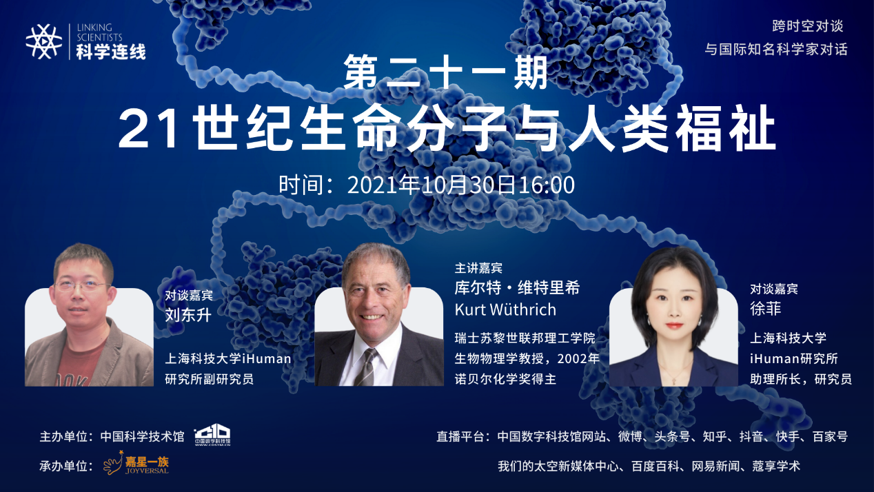 10月30日16:00,“科学连线”将与大家共同认识“生命分子”,本次节目我们邀请到的主讲嘉宾是2002年诺贝尔化学奖获得者库尔特·维特里希,他将就《21世纪生命分子与人类福祉》这一主题为大家分享核酸和蛋白质的线性化学结构、三维结构和生理功能之间的关系,以及相关疾病对人类健康寿命的影响。