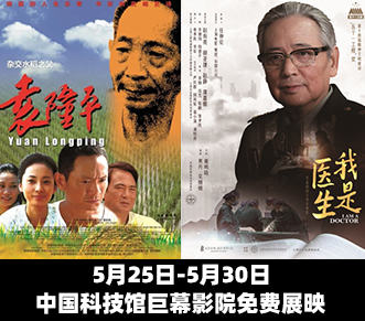 5月25日-5月30日,中国科技馆巨幕影院将免费向公众展映《袁隆平》《我是医生》两部电影。在影片《袁隆平》中,袁隆平院士亲自出演老年时候的自己,他倾其一生、历经数十载的不懈探索和艰难实践,不仅解决了中国人的吃饭问题,更是给人类带来了福音。影片《我是医生》以吴孟超院士为原型,讲述他治病救人70余载,九旬高龄依然坚守在门诊、手术室和病人的病床前,毕生致力于“要把肝癌的帽子去掉”的感人事迹。