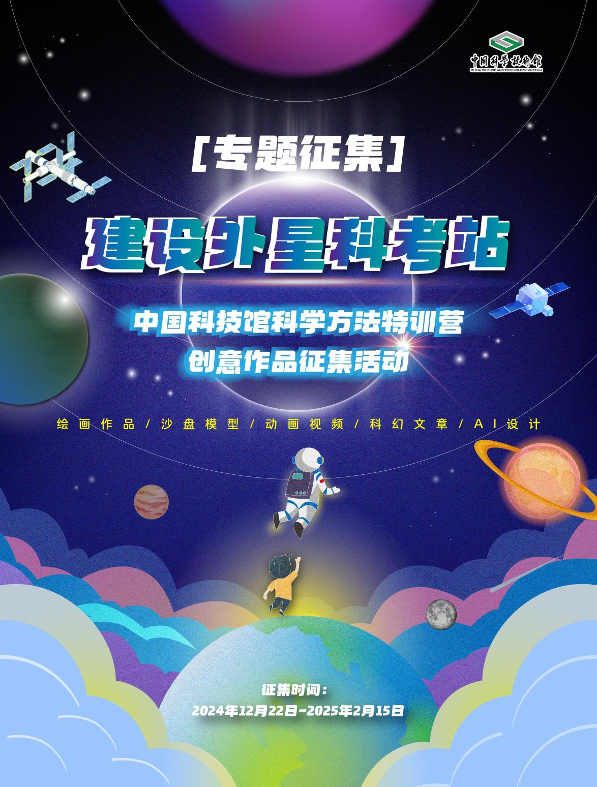 “科学方法特训营”是中国科技馆将于2025年重点打造的,基于真实科研情境导入的,具有体系化、高质量、创新性特点的科学教育项目,主题设定为“筑梦星球”,核心任务为“建设具有一定真实功能的模拟外星科考站”。为引导青少年关注空间科学,充分发挥青少年的想象力与创造力,为青少年提供一个展示科技创意和才华的舞台,中国科技馆举办“建设外星科考站”——中国科技馆科学方法特训营项目创意作品征集活动。