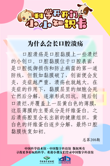小朋友们,你们知道口腔溃疡是什么吗?口腔溃疡伤口虽小,给人带来的折磨可不小,到底为什么嘴巴里会长这让人痛苦万分的小伤口呢?本期《科学开开门》告诉你答案!