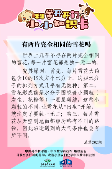 小朋友们,你们喜欢下雪吗?你们观察过雪花的形状吗?到底有没有两片完全相同的雪花呢?快来听本期“科学开开门”吧!