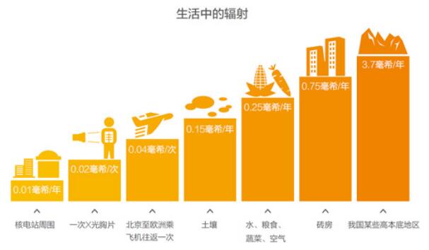 全世界平均来看,每人受到的天然辐射剂量大概为2.4毫希弗(“希弗”是辐射剂量单位)。此外,人们还会受到一定量的人工辐射,其中大部分来自医疗辐射。比如我们去医院拍摄一次X光片大概会受到0.02毫希弗,每天吸一包香烟一年将会受到约1毫希弗。