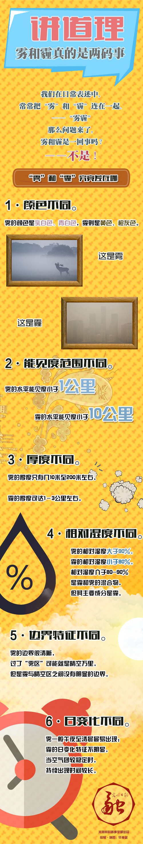 6.日变化不同。雾一般午夜至清晨最易出现;霾的日变化特征不明显,当气团没有大的变化,空气团较稳定时,持续出现时间较长。