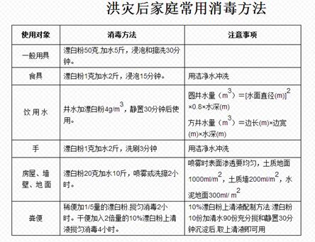1、做好家庭消毒。对被洪水淹过的房屋内外,要开展消毒杀菌工作。一般用“84”消毒液按1:60比例配水后用喷雾器对应消毒的场所进行喷洒。对餐饮具进行消毒 ,用开水煮沸10~30分钟。衣服、被单,需暴晒后进行清洗。经过水淹的井,必须清淘、冲洗与消毒。