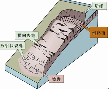 滑坡俗称“地滑”、“走山”、“垮山”、“山剥皮”、“土溜”等。滑坡发生的前兆,一般在山坡中前部会出现规律排列的裂缝;在山坡坡脚处,土体会突然凸起;建在山坡的房屋地板、墙壁出现裂缝,墙体歪斜;山坡上、干涸泉水突然复活或突然干涸;滑坡后缘的裂缝急剧扩展,并从裂缝中冒出热气或冷风;动物惊恐异常,树木枯萎等。