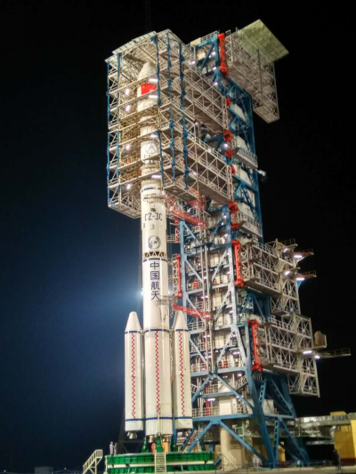 △长三丙火箭伫立在塔架旁
