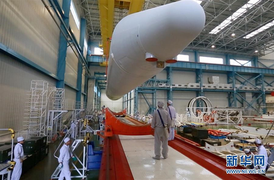 8月18日,长征五号火箭在总装厂房进行吊装。