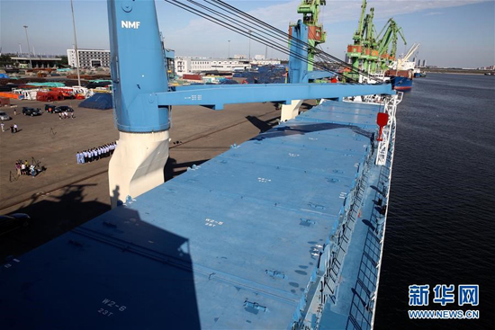 8月25日,在天津港,装载长征五号运载火箭的远望号火箭运输船准备启航。