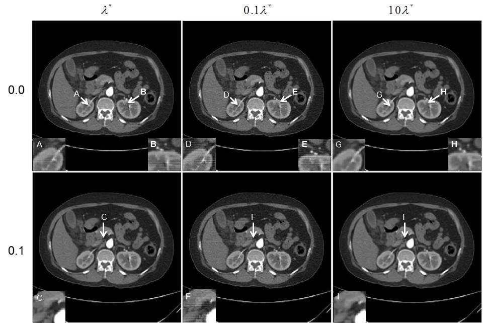 图1. 正则化参数选取模型有效性和准确性验证。第一列是利用选取模型得到正则化参数的重建结果,第二列和第三列分别取该参数的0.1倍和10倍。第一、二行分别为无噪声投影数据以及加入0.1%高斯噪声的投影数据的重建结果。结果表明参数选取过小(0.1倍,第二列结果)会使重建图像产生条形伪影和较高的噪声水平,参数选取过大(10倍,第三列结果)会使重建图像信噪比和空间分辨率降低。