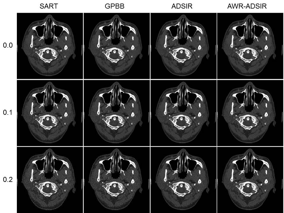 图2. 字典学习重建算法与对比算法重建结果比较。第四列是本文提出的算法重建结果,一到三列为对比算法,分别为SART算法、GPBB算法以及经验选取正则化参数的传统字典学习算法。第一到三行分别为无噪声投影数据以及加入0.1%、0.2%高斯噪声的投影数据的重建结果。由该图可以看到,本文提出的算法重建图像的空间分辨率和图像质量高于SART和GPBB算法,与传统字典学习算法相当,说明正则化参数选取模型的准确性以及字典学习重建算法的优越性。