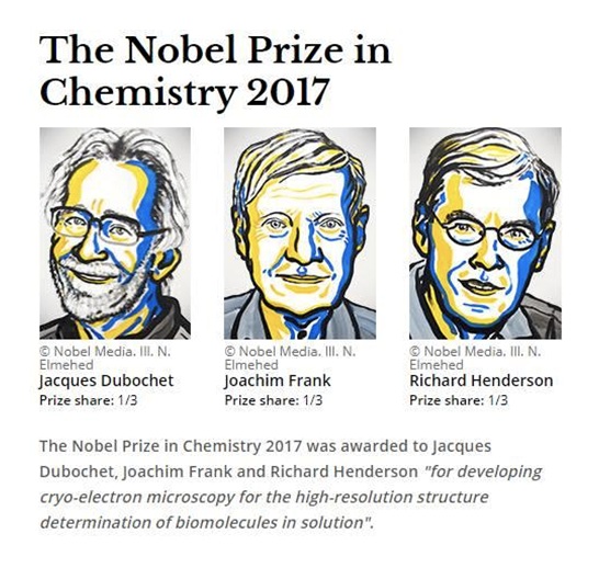 2017年度的诺贝尔化学奖10月4日授予贾克•杜伯谢(Jacques Dubochet)、约阿希姆•弗兰克(Joachim Frank)和理查德•亨德森(Richard Henderson),表彰他们在开发用于溶液中生物分子高分辨率结构测定的冷冻电镜技术。3名科学家分别来自瑞士、美国和英国,他们将共同分享900万瑞典克朗(约合人民币738.49万元)奖金。