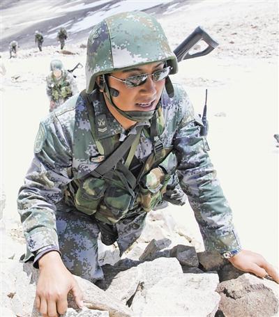 六月,内地已是盛夏时节,酷暑难耐,可海拔平均四千米以上的帕米尔高原依然白雪皑皑,冰雪覆盖。图为六月二十五日,新疆喀什军分区巡防官兵艰难地行进在中塔边境。(宋威摄)