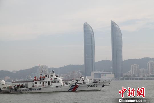 7月27日至31日,福建省海警第三支队编队6艘舰艇100余人在厦门港至东山湾海域拉开了历时5天的海警部队实兵大演练。这是编队经过厦门地标双子大厦。(洪晨晖 摄)