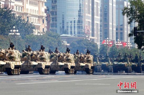 中新网北京9月3日电 (张应翔 陈金财 周仔成)9月3日,上午10时许,身着荒漠迷彩戎装的履带自行火炮驶过天安门前广场,向世人展示来自万里之遥的新疆军区部队全体戍边将士的风采。
