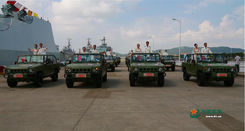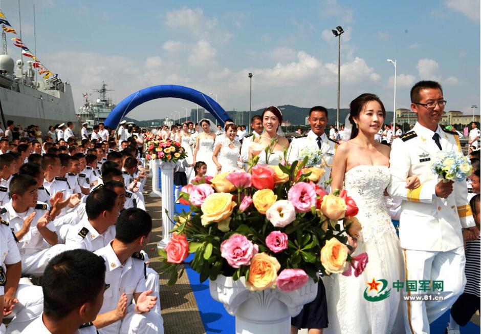 9月26日,中秋佳节前夕。东海舰队某驱逐舰支队为27名推迟婚礼的官兵和他们的新娘,举办了一场简朴而又隆重的集体婚礼。由于所在单位使命任务繁重,他们中的许多人每年在海上的时间都在半年以上,很多人因为执行任务将婚期一推再推。