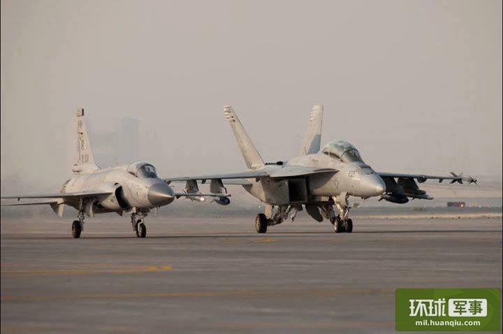 中巴联合研制“枭龙”战斗机与美制F/A-18战斗机并列停放。